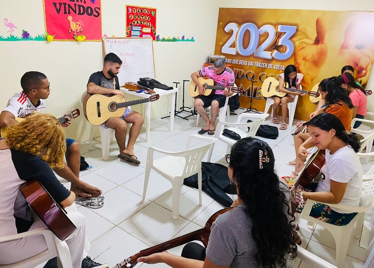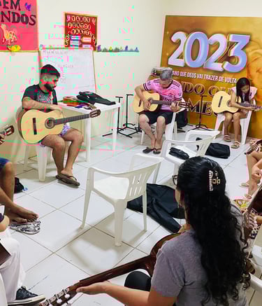 Oferecemos aulas de violão e organizamos festas para crianças em situação de vulnerabilidade, proporcionando momentos de alegria, aprendizado e desenvolvimento cultural